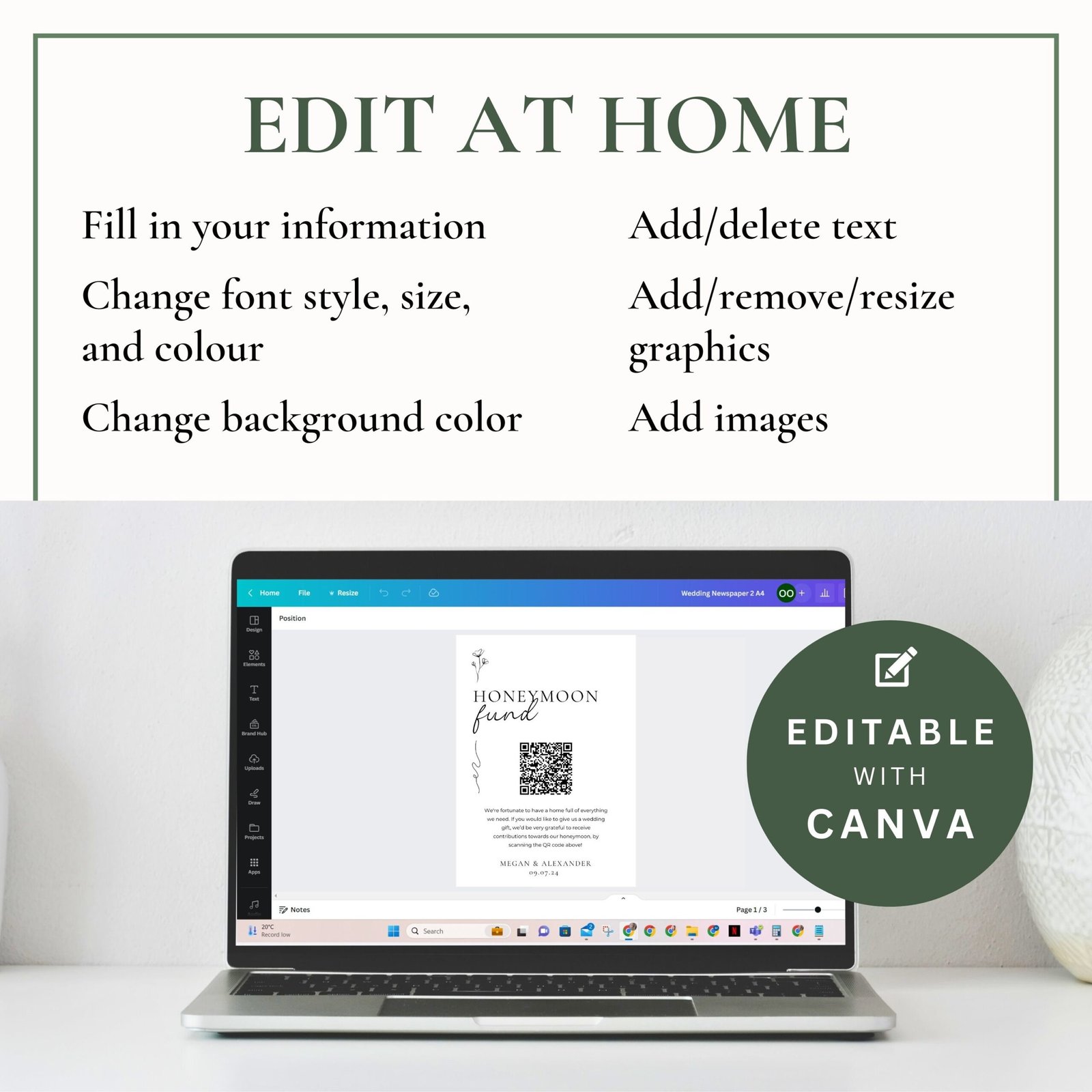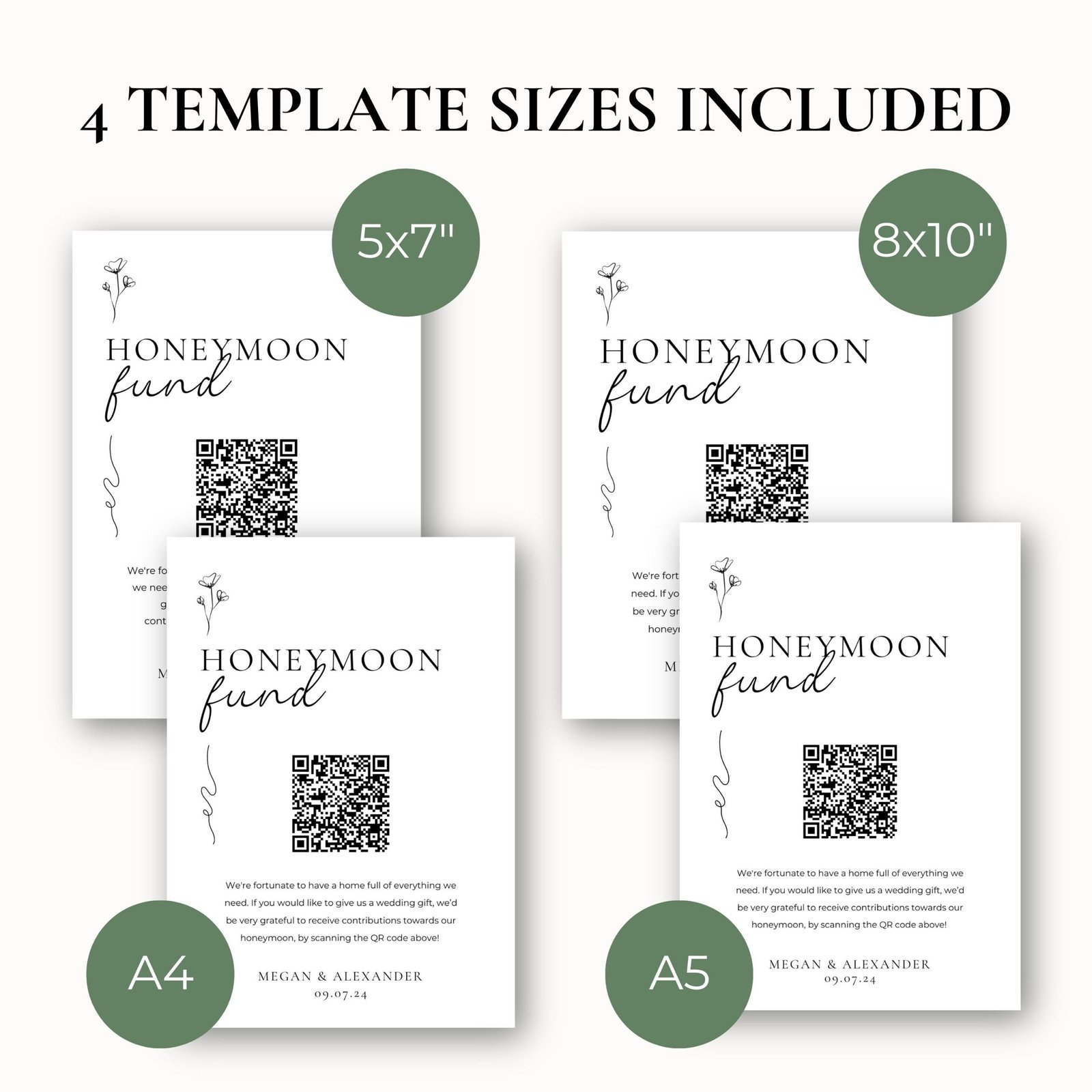 • Custom QR Code: Personalize your sign with a unique QR code linked to your Honeyfund or preferred honeymoon fund for seamless contributions.