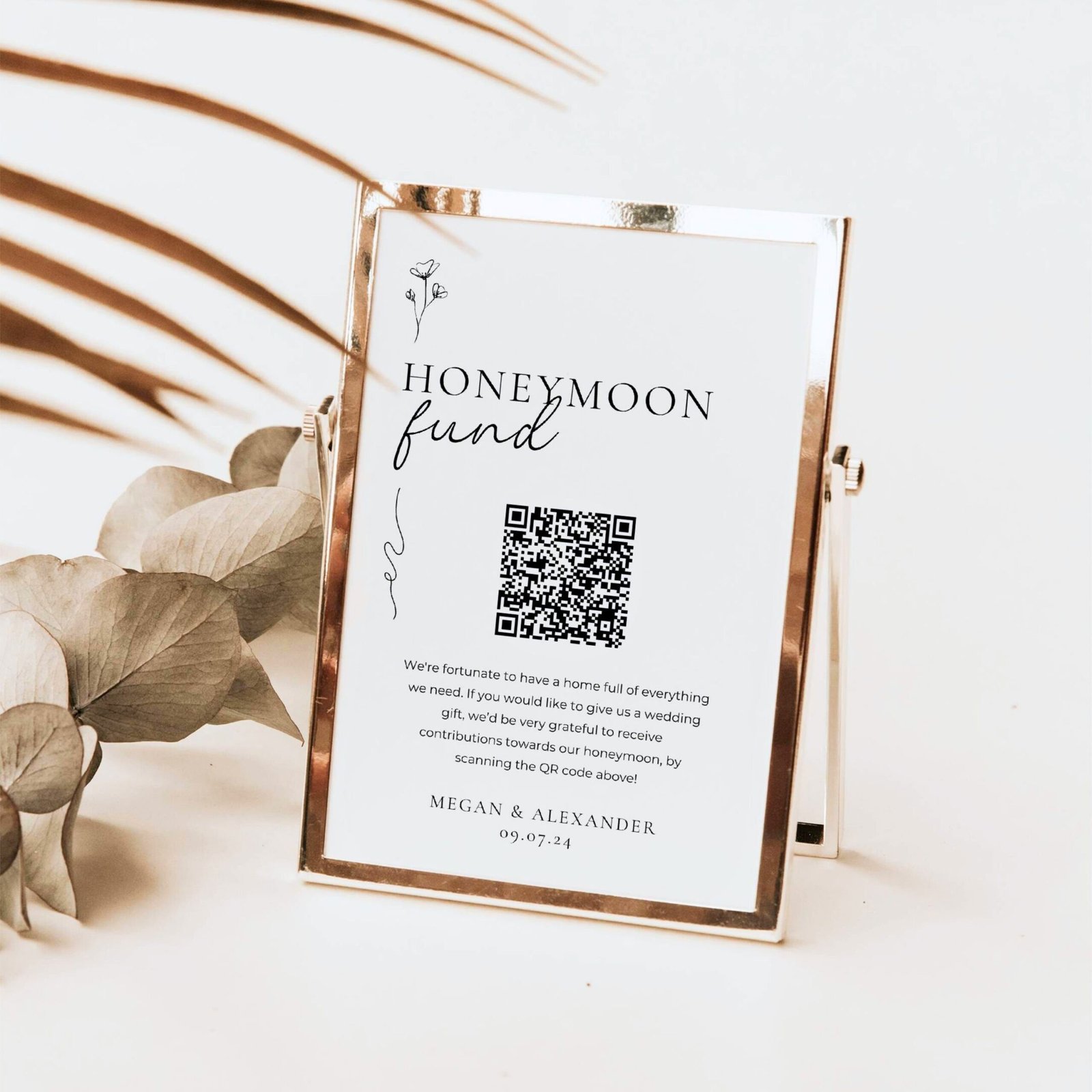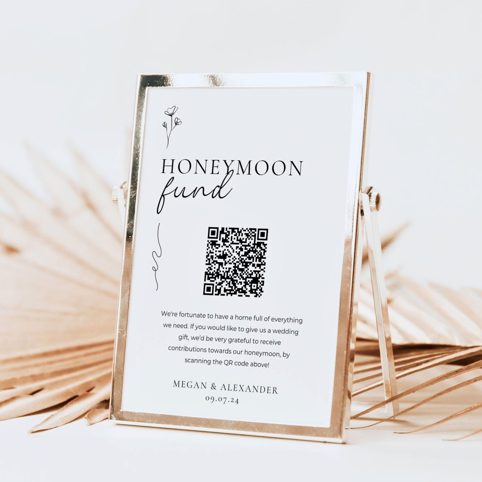 Ready to revolutionize your wedding registry? Introducing our Custom Honeymoon Fund QR Code Sign – a contemporary and stylish solution for couples looking to streamline their gift registry while embarking on their post-wedding adventures. Elevate your wedding experience with this modern cash gift option that adds a touch of sophistication to your celebration.