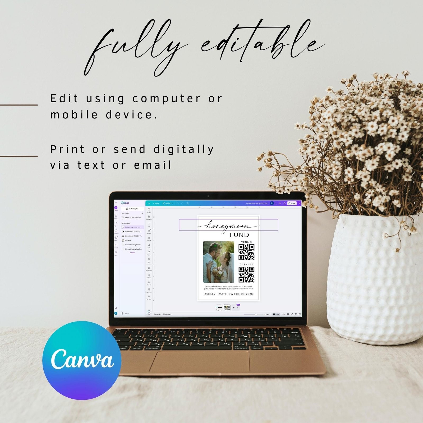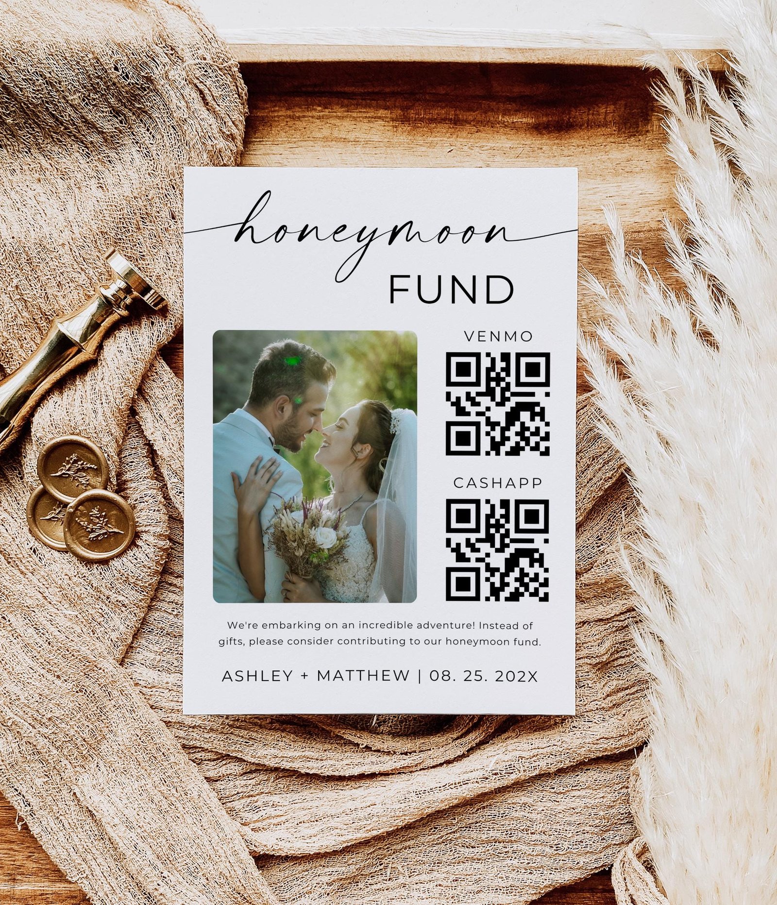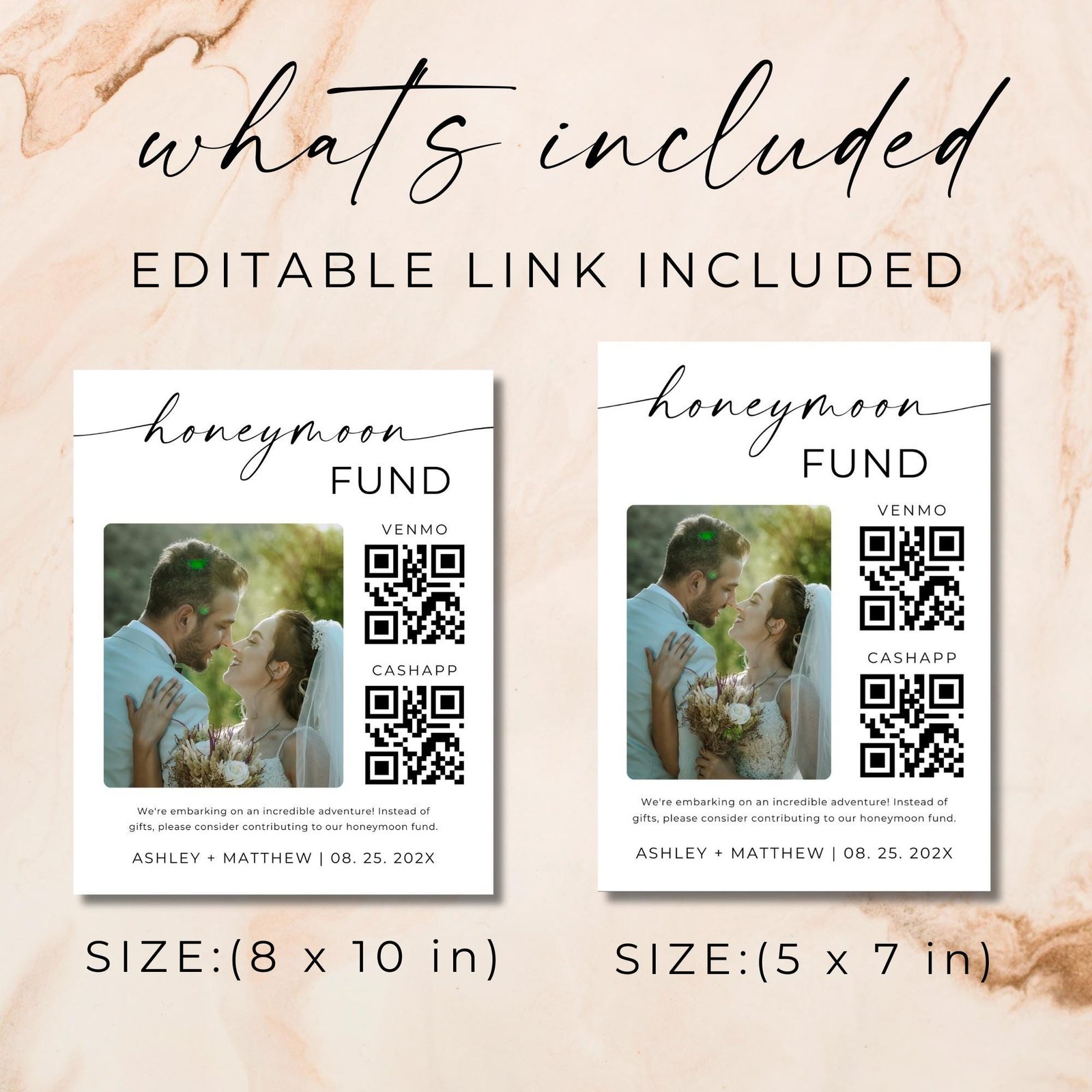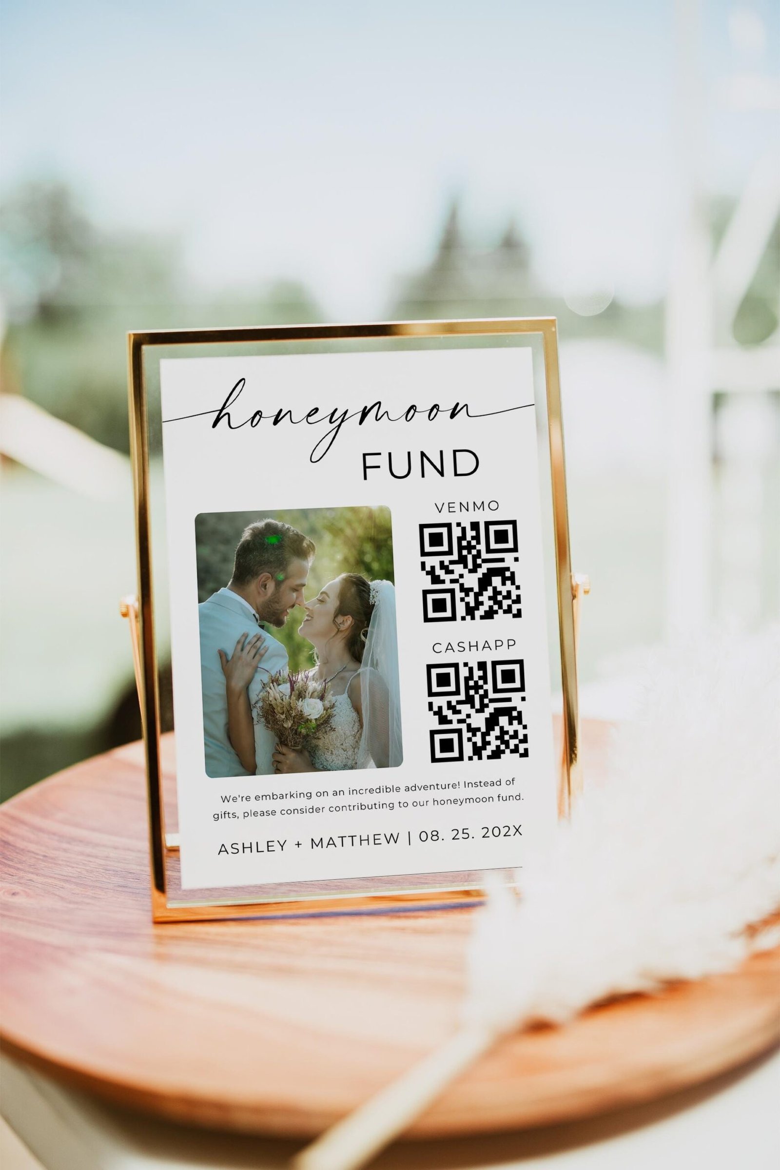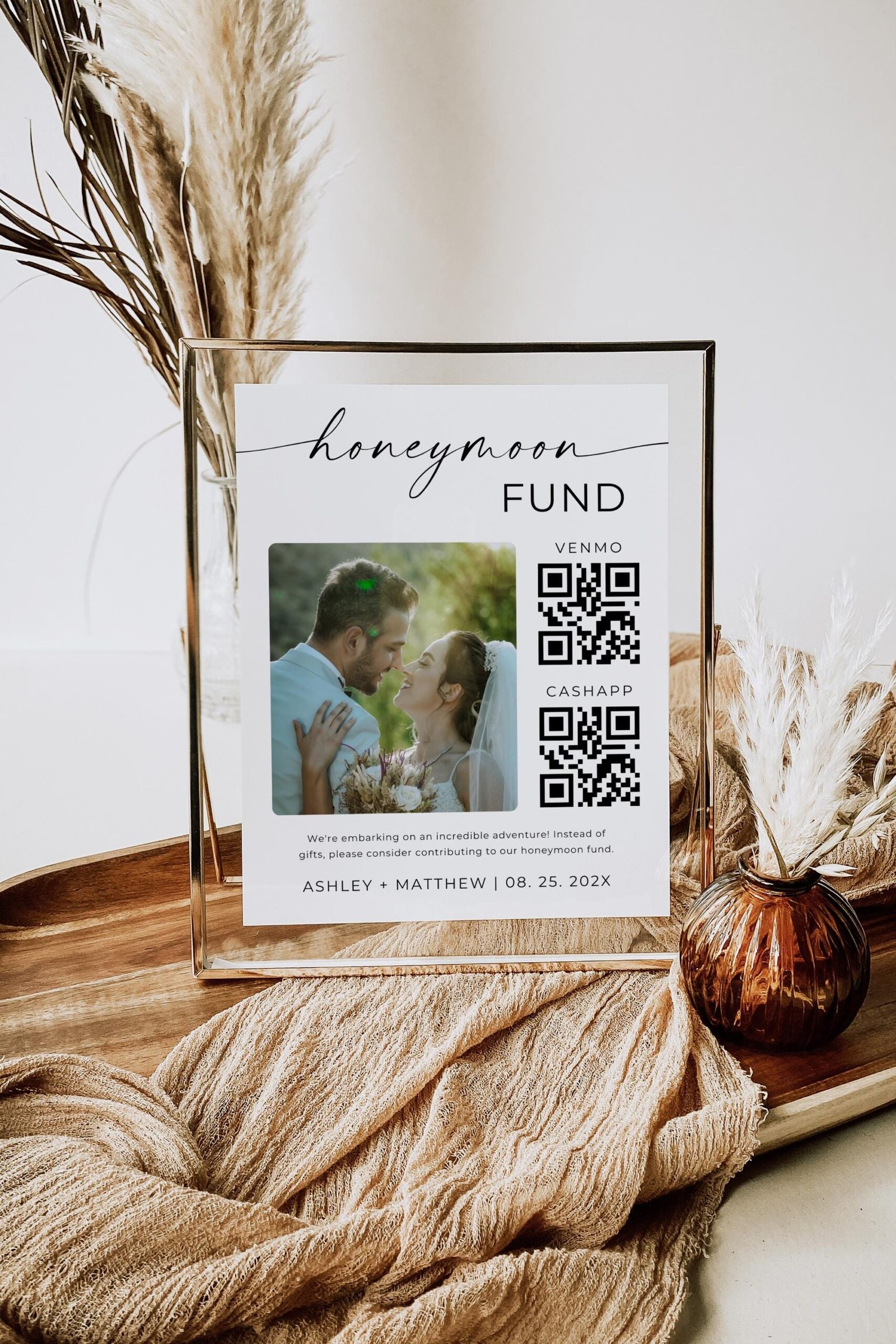 Make your big day even more memorable with a modern twist on gift-giving. The Honeymoon Fund Wedding Sign QR Code allows guests to easily donate to your honeymoon fund by scanning a custom QR code that links directly to your Venmo, PayPal, or preferred payment platform.