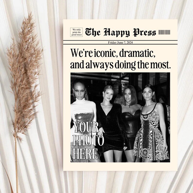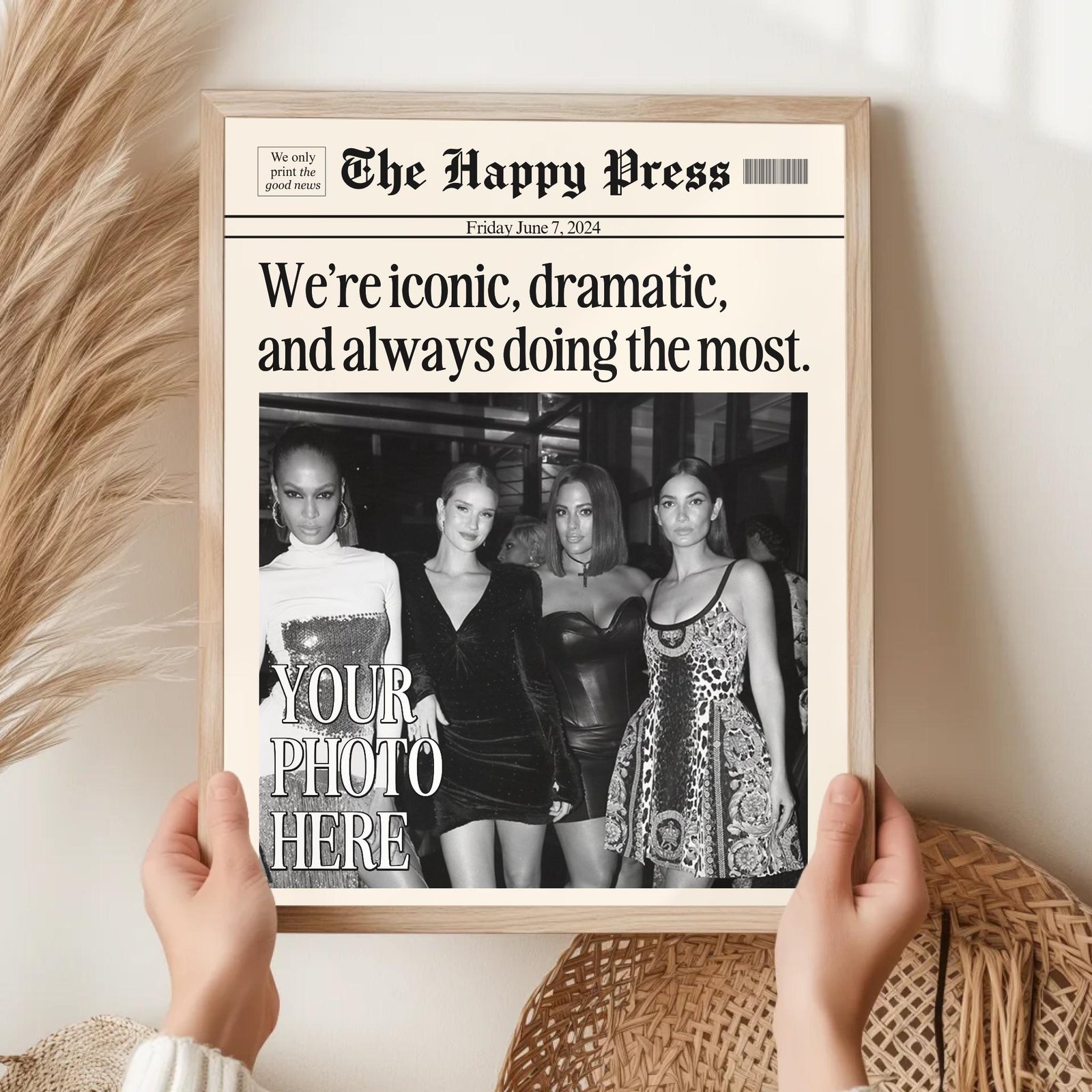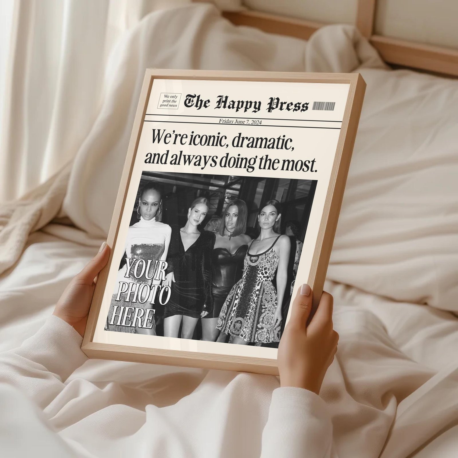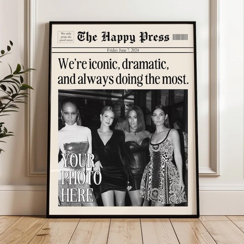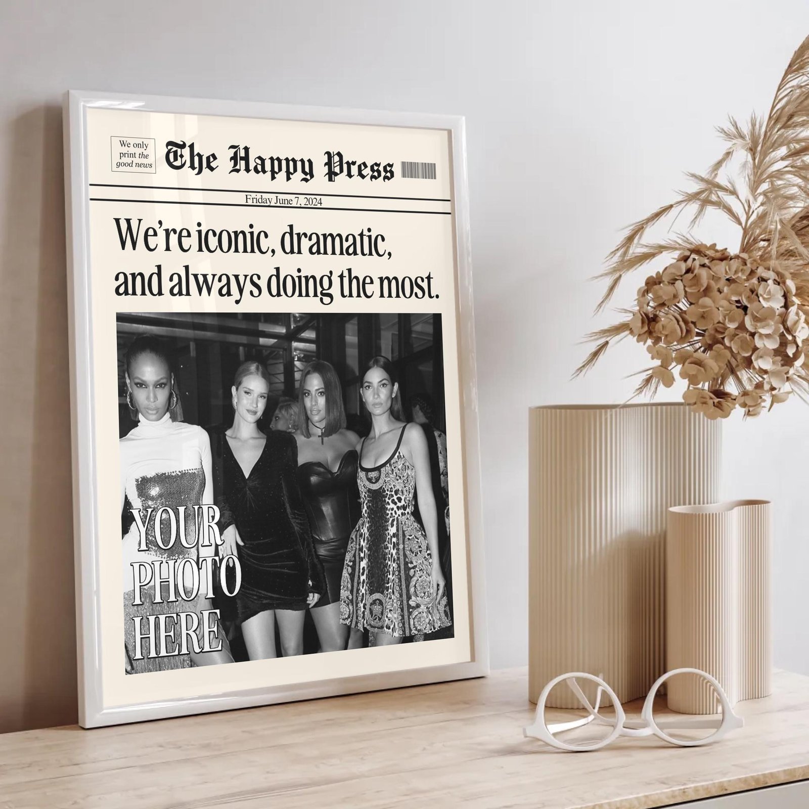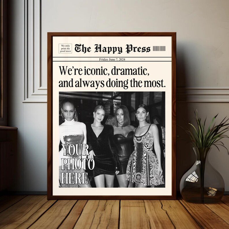 Make your memories timeless with this vintage-inspired custom newspaper print! Whether it’s for your dorm, living room, or as a heartfelt gift, this print will elevate any space with a unique personal touch. Upload your favorite photo, choose your headline, and let me create a piece that feels straight out of a classic newspaper!