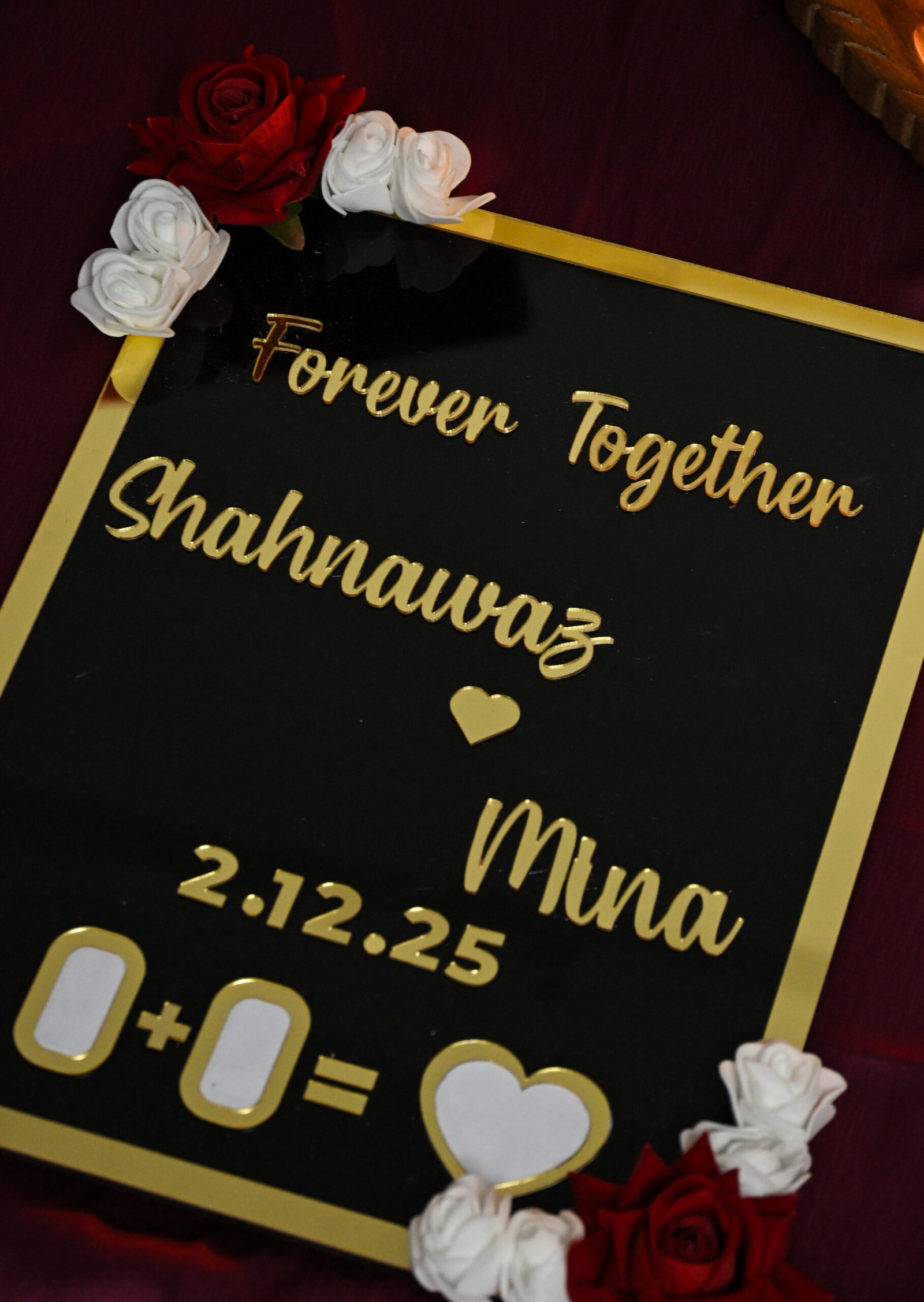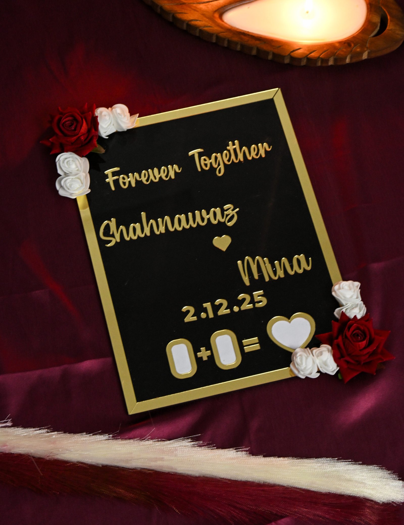 Crafted with a base of high-quality MDF, the Thumb Board offers durability and a premium feel. The surface is designed using high-grade acrylic, giving the board a sleek, glossy appearance that enhances the intricacy of the thumb impression design. Adding to its romantic aesthetic, artificial roses are delicately placed on two corners, creating a beautiful blend of texture, charm, and sophistication.